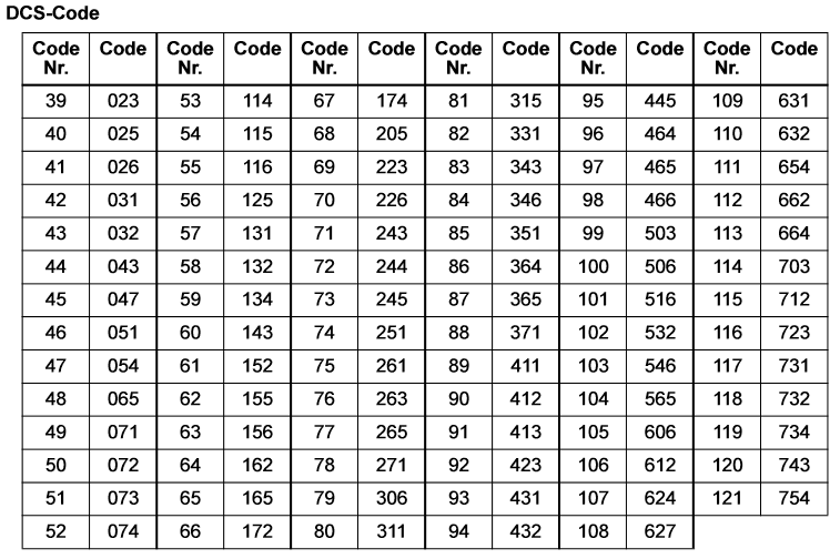 Subcodes 1 t/m 38 zijn gelijk aan CTCSS tooncodes.